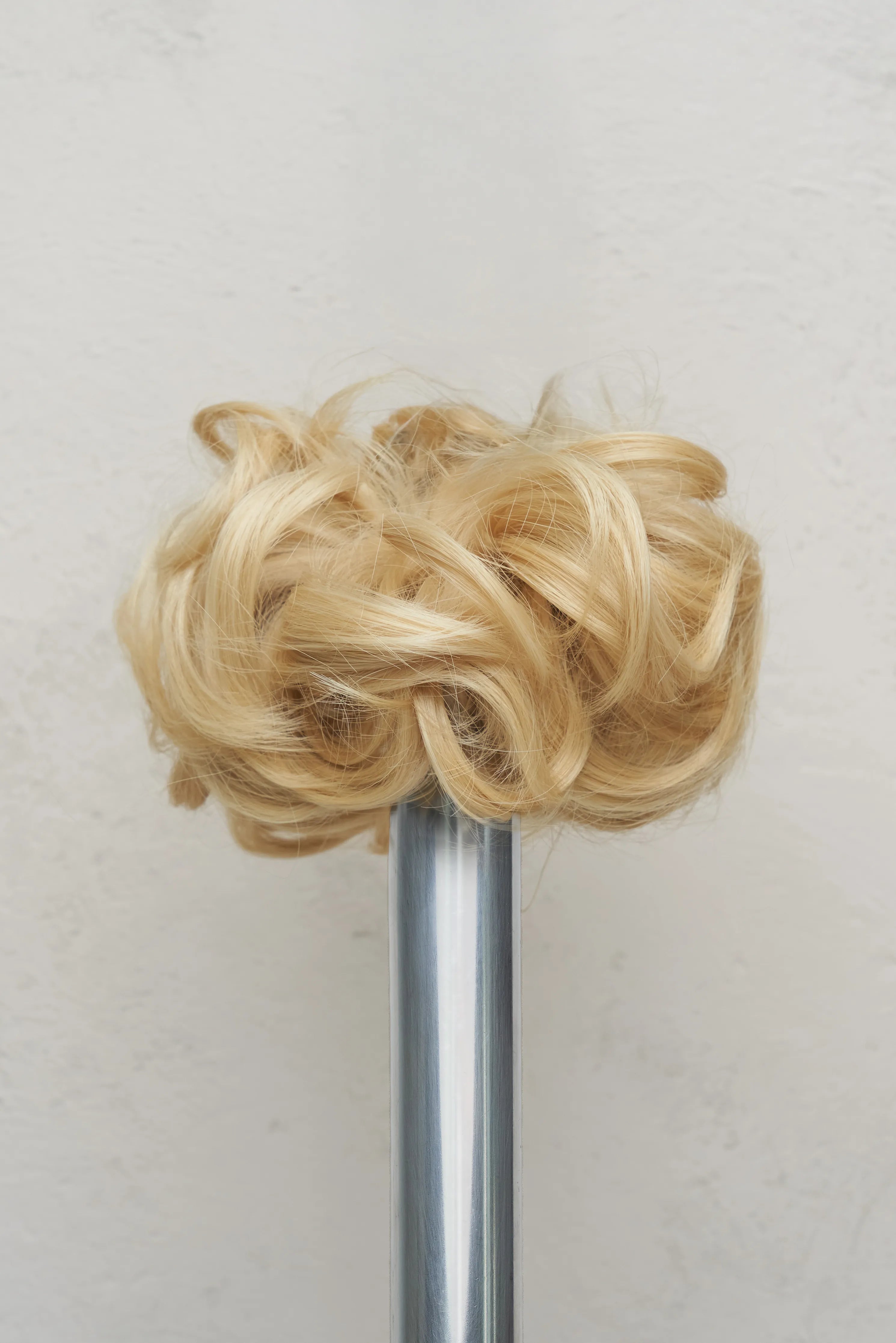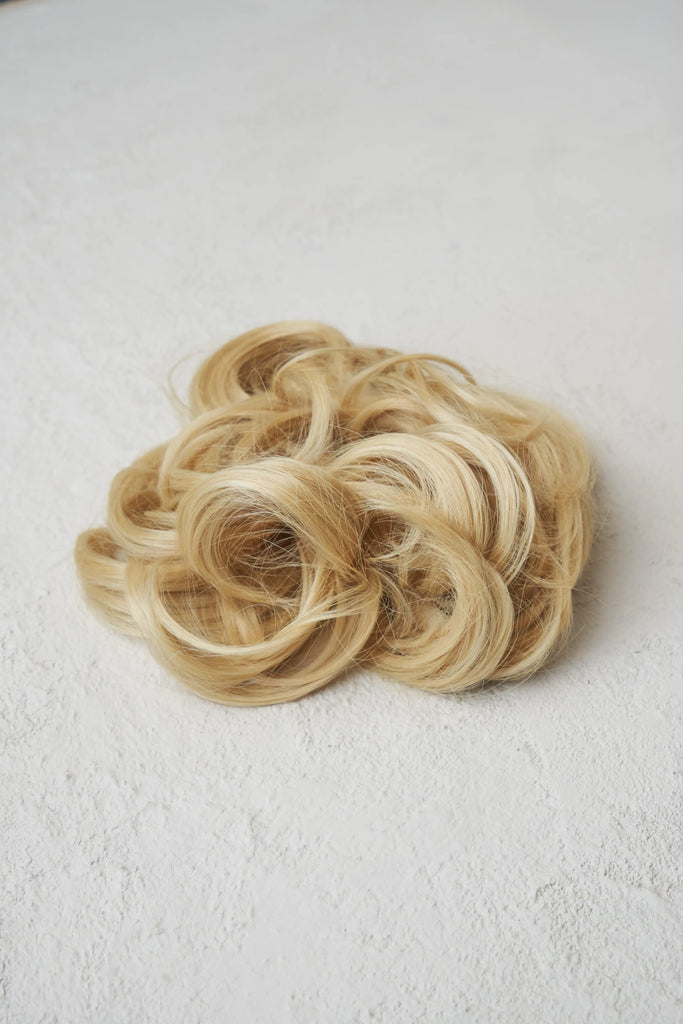 Start by putting your own hair into a bun where you want the style to sit. Then, wrap the Akena Hair Messy Bun around it like you would with a regular scrunchie. Gently pull and shape the hairpiece until you get the look you want. Done in seconds.